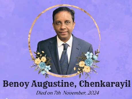 AUGUSTINE Benoy peacefully at Home surrounded by His loving family 7th November 2024. Beloved Husband of Shiny, much loved Father of Beon, Shiana and Freya. Loving son of Augustine and Kuttiamma and brother of Betty .R.I.P.