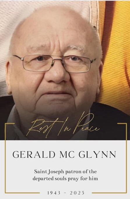 We regret to inform you that the death has taken place of Gerald McGlynn peacefully on March 22 2025, may he rest in peace. Late of 84 Saint Canices Park, Eglinton. Beloved husband of Ann and loving father of Michael, Gerald-Martin and Ann-Marie. Devoted grandfather of Tia, Katie, Alex, Michaela, Lucy and Amelia. Son of the late Annie-Mary and Frank R.I.P and dear brother of Francie and the late Oliver and Marian R.I.P.