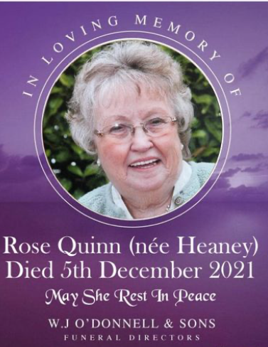 QUINN (née Heaney) Rose (3 Ballydugennan Villas, Toomebridge) Die don 5th December 2021, peacefully at hospital.
